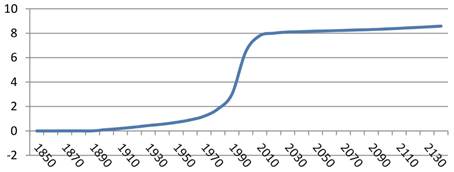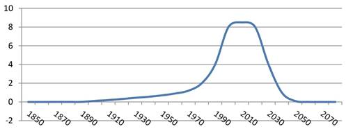 En relación con la tercera hipótesis, más optimista todavía, se observa como la función deja de ser logística para seguir un modelo lognormal. En esta última, vista con perspectiva histórica, las altas prevalencias resultaron sólo un pico relativamente breve en la historia de la enfermedad (figura 5). La prevalencia no se hace relevante hasta mediados del siglo XX, con la generalización de la “sedentarización laboral” y el incremento de la esperanza de vida. El crecimiento se mantiene hasta llegar al punto de inflexión calculado en la proyección logística, del 8,6% para el 2025. Así surge, como resultado, esta tercera hipótesis en la cual la prevalencia no se mantendrá en ese nivel (8,5-9%) por mucho tiempo sino que, los cambios sociales y los avances científico-médicos acabarán por reducirla.
