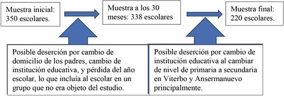 Se escogieron cursos de 25 a 30 estudiantes, de ambos sexos, con condiciones culturales similares y pertenecientes a estratos socioeconómicos 1 (bajo-bajo), 2 (bajo) y 3 (medio-bajo). Se consideró la voluntad de participación del Hospital Municipal, se excluyeron las instituciones educativas rurales y los grupos de escolares con resistencia a la intervención. Se realizaron sesiones de trabajo con las autoridades de salud de las alcaldías y del Hospital Municipal para logar una colaboración efectiva. El número de niños que conformaron la muestra hasta el final del estudio fue de 220. Al finalizar los 72 meses se habían perdido 130 niños (figura 1).