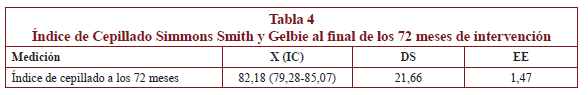 El índice de Cepillado de Simmons, Smith y Gelbie, que se tomó solo en el registro a los 72 meses, demostró que los escolares habían adquirido las habilidades y destrezas para eliminar la placa bacteriana en un 82,18% de las superficies dentales (tabla 4).