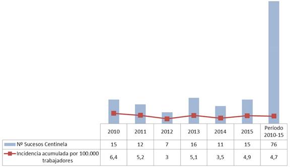 Resultados: En el período de estudio se notificaron 79 sucesos centinela (en 22 se concluyó la investigación) y 50 casos de EEPP ( 24% recaídas). No encontramos diferencias estadísticamente significativas en la edad (41 vs 40 años), ni el sexo (40,9 % mujeres vs 44,7% hombres), ni la proporción que causó baja laboral (45% y 36,8%), ni el tamaño, la actividad de la empresa o la ocupación del trabajador. Donde sí se encontramos diferencias fue en el tiempo medio de exposición antes de la declaración/notificación, significativamente mayor en las EEPP que en los centinela (94,1 vs 22,2 meses), 72 meses mayor.