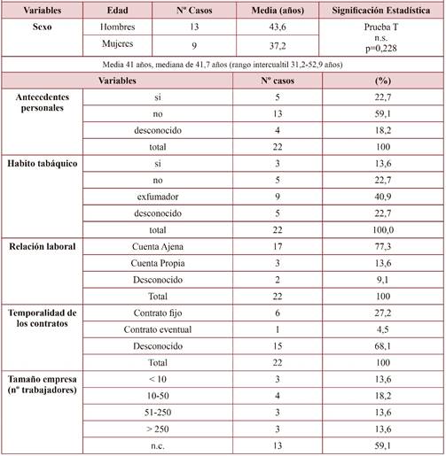 Respecto a la situación de incapacidad o no, hallamos que el 40,9% estaba de baja laboral en el momento de la notificación (9 de los 22 casos). En 2 casos no se registró esta variable.