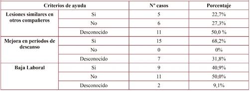 Criterios de ayuda para la comunicación del caso como de origen laboral. La cumplimentación de los ítems de referencia para la valoración del caso como laboral mostró que el 22,7% de los casos tenían compañeros con la misma patología y el 68,2% mejoraron en período de descanso (tabla 3).