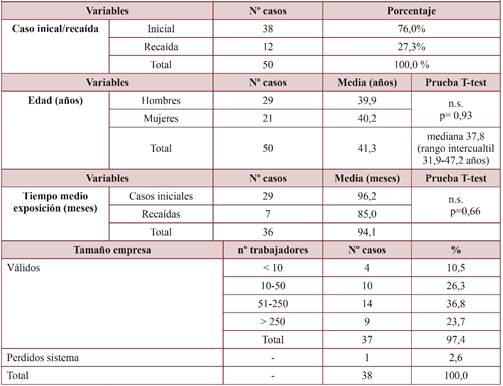 Results: In the period, 79 sentinel events were reported (in 22 the investigation was concluded) and 50 cases of OD (24% relapses). We did not find statistically significant differences in age (41 vs. 40 years), nor gender (40.9% women vs. 44.7%), nor proportion that caused sick leave (45% and 36.8%), nor size, activity of the company or occupation of the worker. Where differences are found was in the meantime of exposure before the recognition/notification, significantly higher in the OD than in the sentinel (94.1 vs. 22.2 months), 72 months longer.
