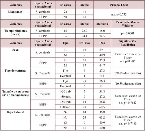 Métodos: Se identificaron los casos de AO notificados como sucesos centinela en el Programa de Vigilancia Epidemiológica en Salud Laboral en Navarra desde enero de 2010 a diciembre de 2015 y los casos declarados como EEPP (asma). La población a estudio fue la población navarra ocupada (357.200 de media). En los casos con consentimiento se compararon las características clínicas y laborales con las de EEPP. Mediante el programa informático SPSS Statistics® 20v se calcularon diferencias de medias mediante prueba T para muestras independientes y diferencias de porcentajes de distribución mediante Test de Chi cuadrado, test exacto de Fisher y test no paramétricos cuando no se cumplían condiciones de aplicación. Como indicador de notificación se calculó la incidencia acumulada por 100.000 trabajadores para cada año de seguimiento del programa.