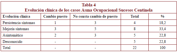 Evolución clínica de los casos AO Sucesos Centinela. En 2017 se contactó telefónicamente con los pacientes para completar la información sobre la evolución de la enfermedad. De los 22 sucesos centinela de sospecha de AO, tuvimos 5 pérdidas de seguimiento, de los localizados, encontramos que en 12 de los casos persistía la sintomatología, aunque la mayoría (8 casos) habían mejorado gracias a la evitación del agente causante y un adecuado tratamiento médico. Los 5 casos restantes se encontraban asintomáticos en el momento del seguimiento. La relación de la evolución clínica en función de la adaptación o cambio de puesto de trabajo, se presenta en la tabla 4. Se observa que en 5 de los 6 casos en que se realizó un cambio de puesto habían evolucionando a mejoría clínica.