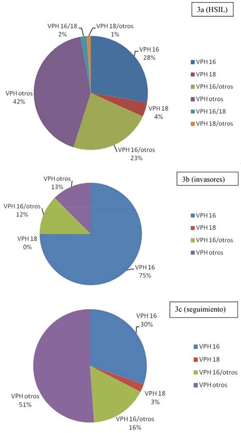 En la tabla 3 se describen los casos invasores desde el estadio IB. En la figura 3 se muestran los casos positivos para el VPH por genotipos en los HSIL (figura 3a) y se aprecia que el 58% son positivos para los virus oncogéncios 16/18; representando en los invasores (figura 3b) un 87% y en el seguimiento un 49%. No se representan en la figura 3a treinta y tres casos y en la figura 3b dos casos en los que no se conoce el genotipo. Existen también 4 casos de VPH negativo: 2 preinvasores, negativos con cobas 4800® y con captura de híbridos, que tienen biopsia con positividad para p16INK4a; y dos invasores, un carcinoma escamoso y un adenocarcinoma. Este último es un verdadero negativo que tiene p16INK4a negativa y estudio de VPH en biopsia por PCR (PGMY09/PGMY11 y GP5+/GP6+) también negativo. En la figura 3c se muestra la distribución de genotipos en el seguimiento y se puede ver que los genotipos de riesgo (16 y/o 18) se hallan menos representados que en los HSIL e invasores (48,8%).