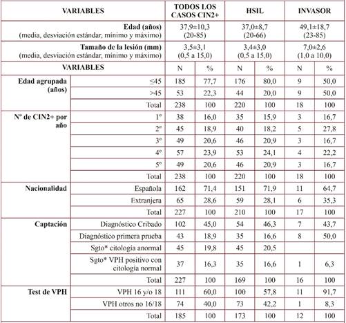 En la tabla 1 se recogen las características epidemiológicas, clínicas e histológicas de todos los casos. La nación extranjera de origen más frecuente es Rumanía con 31 pacientes (13,7%) seguida de Colombia con 5 (2,21%). Las pacientes extranjeras de origen europeo son 45 (19,91%) y de origen latinoamericano 17 (7,52%). De los 37(15,5%) casos seguidos por VPH positivo con citología normal sólo una paciente fue menor de 30 años (en el grupo de CIN2+ hay un total de 53 casos menores de 30 años, 22,3%). La sensibilidad de la citología es de 79,4 (IC 95%: 71,9-82,9) y la del test del VPH de 98,7 (IC95%: 95,5-99,3). El VPP: 78,8 (IC 95%: 73,9-83,1). Se estudian con p16INK4a 112 casos (50,9%).