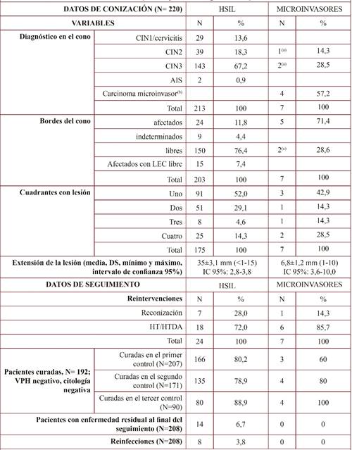 Resultados: Se detectaron 238 displasias de alto grado (HSIL) o mayor con una media de edad de 37,9±10,3 años y el 60,0% fueron positivas a los genotipos 16 y/o 18. Se conizaron 220 pacientes (92,4%) y en 25 (11,4%) se precisó reconización o histerectomía. Se diagnosticó HSIL en 220 pacientes (92,4%) y carcinoma invasor en 18 (7,6%), 7 microinvasores (2,9%). En el 14,4% de los conos no se halló HSIL (conos blancos) y el 83,2% tuvo bordes libres. El 52,0% tenía afectación en un solo cuadrante y el tamaño tuvo de media 3,5±3,1mm. Sólo 14 pacientes (6,7%) continuaban enfermas (VPH-AR positivo) tras tratamiento. Se halló, en nuestros casos, asociación estadísticamente significativa entre bordes afectados y edad mayor de 45 años (p=0,005).