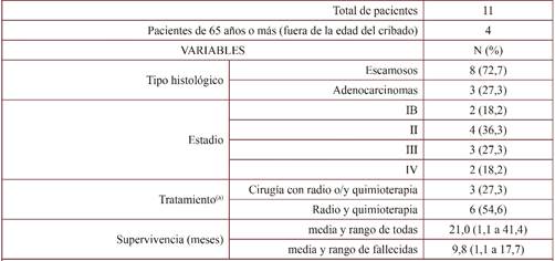 El cribado con co-test ha detectado lesiones preinvasoras, pequeñas, localizadas en un solo cuadrante y carcinomas microinvasores. La conización con asa fue eficaz logrando la curación de la mayoría de las pacientes.