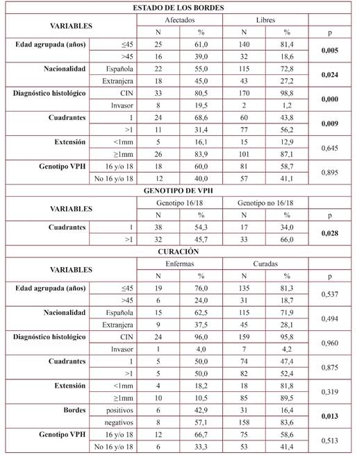 A la asociación “paradójica” que hemos hallado entre bordes positivos y afectación de un cuadrante no le hemos encontrado explicación o se debe a la dificultad de localización de las lesiones pequeñas. Tampoco hemos hallado explicación al hallazgo de que el genotipo 16/18 se asocie con menor extensión de la lesión (afectación de un cuadrante frente a más de uno).