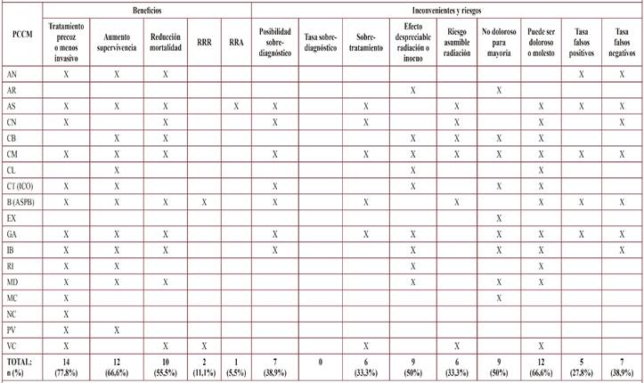 Cuatro programas (Asturias, Agència de Salut Pública de Barcelona, Castilla La Mancha y País Valenciano) presentaban información sobre el 60% o más de los ítems del cuestionario; en el otro extremo, ocho programas (Aragón, Castilla y León, Extremadura, Canarias, La Rioja, Murcia, Navarra y Euskadi) no llegan al 40% de los ítems. Cuatro programas (Asturias, Barcelona, Castilla La Mancha y Baleares) resumían la información sobre beneficios y riesgos del cribado con un pictograma.