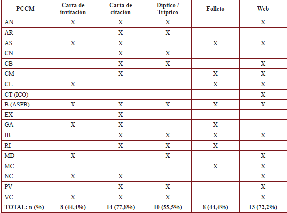 Para la obtención de los materiales informativos se estableció contacto, en primer lugar, con los responsables de los PCCM, solicitando información sobre el procedimiento de captación del programa y ejemplares de los modelos de material informativo utilizados en la campaña en curso, como cartas de invitación (cartas de presentación del programa donde se invita a participar en la campaña) y cartas de citación (donde se cita a la usuaria para realizar la mamografía en una fecha y hora determinada) que llegan a los domicilios de las mujeres subsidiarias de cribado, trípticos o folletos informativos y páginas web. Cuando no se obtuvo respuesta tras una segunda solicitud se contactó con asociaciones o profesionales sanitarios de la comunidad autónoma para que actuasen como facilitadores de la información. De forma paralela se revisó la información disponible en las webs oficiales de los programas o de las Consejerías de Salud. Se excluyeron los contenidos de la web que no estaban orientadas a la población.
