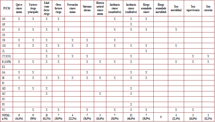 Información general sobre el cáncer de mama (tabla 3). La mayoría de los programas reseñaban cualitativa o cuantitativamente la prevalencia del cáncer de mama y enumeraban sus factores de riesgo, y casi la mitad de ellos informaban sobre qué es el cáncer de mama y sus síntomas. Sin embargo, se informaba con menos frecuencia el riesgo acumulado de sufrir cáncer de mama, su historia natural, su pronóstico y los estilos de vida preventivos. Ningún PCCM mencionaba el riesgo acumulado de morir por cáncer de mama a lo largo de la vida.
