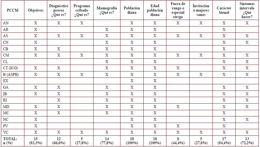 Objetivos y características del programa (tabla 4). La mayoría de los PCCM enunciaban los objetivos de los programas de cribado y lo que significa el diagnóstico precoz, pero solo unas pocas explicaban por qué se invita a mujeres sanas. Gran parte de los programas revelaban en qué consiste la mamografía y qué hacer en caso de presentar síntomas en el intervalo entre cribado y cribado.