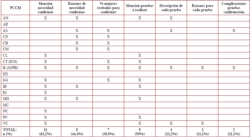 Pruebas de confirmación diagnóstica (tabla 6). La mayoría de los PCCM mencionaban la posibilidad de ser requeridas para confirmar los hallazgos de la mamografía, mientras que el porcentaje de las que argumentaron los motivos para ser sometidas a estas pruebas adicionales y las que citaron la probabilidad de que esto suceda bajó a menos de la mitad. Uno de cada dos programas mencionaron las pruebas que se pueden llegar a hacer, pero muy pocas las describían con más detalle, razonaron su necesidad o informaron sobre sus inconvenientes o posibles complicaciones. Tres CCAA (Aragón, Extremadura y Murcia) no aportaron nada de información sobre las pruebas de confirmación diagnóstica.