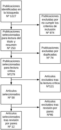 La búsqueda sistemática inicial generó 1227 resultados. Después de aplicar los filtros correspondientes y descartar los artículos que estaban repetidos y los que no cumplían los criterios de selección y tras la lectura del título y del resumen, se redujo a 179 resultados. Siguiendo con el cribado, tras la lectura crítica de los estudios se retiraron 46, quedando un total de 12 artículos seleccionados (figura 1).