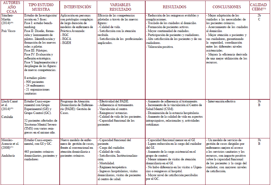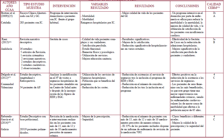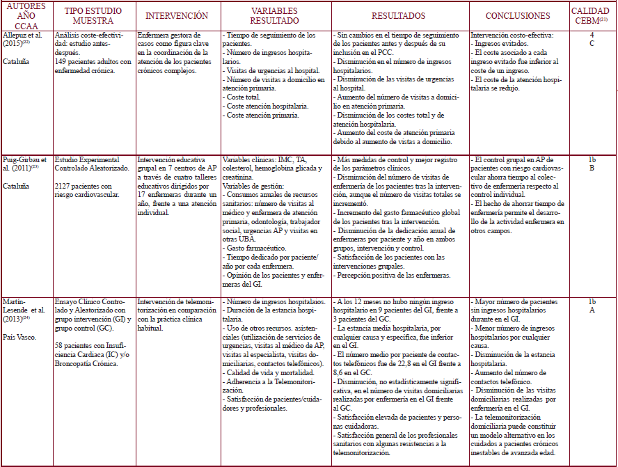 Methods: Systematic review of the literature on the nurse contribution to address the chronicity in adult patients in Spain. The search was carried out in Medline / Pubmed, Cochrane, EMBASE, LILACS, CINAHL, IME and CUIDEN, databases. Inclusion criteria: written articles in Castilian and English published between 2007 and 2016 involving patients with chronic disease in all their life stages. The quality of the studies was assessed following Prisma criteria and the CEBM levels of evidence and recommendation.