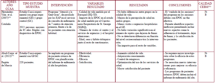 Abad-Corpa et al33 analizaron los efectos de un programa dirigido a pacientes con EPOC que incluyó un informe de enfermería al alta hospitalaria en 220 pacientes; los resultados obtenidos evidenciaron un aumento en la calidad de vida de los pacientes del grupo intervenido, una mayor adquisición de conocimientos relacionados con su proceso, un mejor control de reingresos y una optimización en el uso de los servicios de salud junto a una mayor satisfacción de los pacientes.