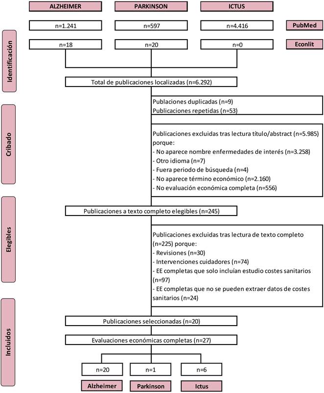 Métodos: Se realizó una búsqueda sistemática en PubMed y Econlit para determinar las publicaciones que contenían EE sobre Alzheimer, Parkinson e Ictus. Criterios de inclusión: a) EE completas sobre las enfermedades en estudio; b) periodo enero 2006-julio 2016; y c) en inglés o español.