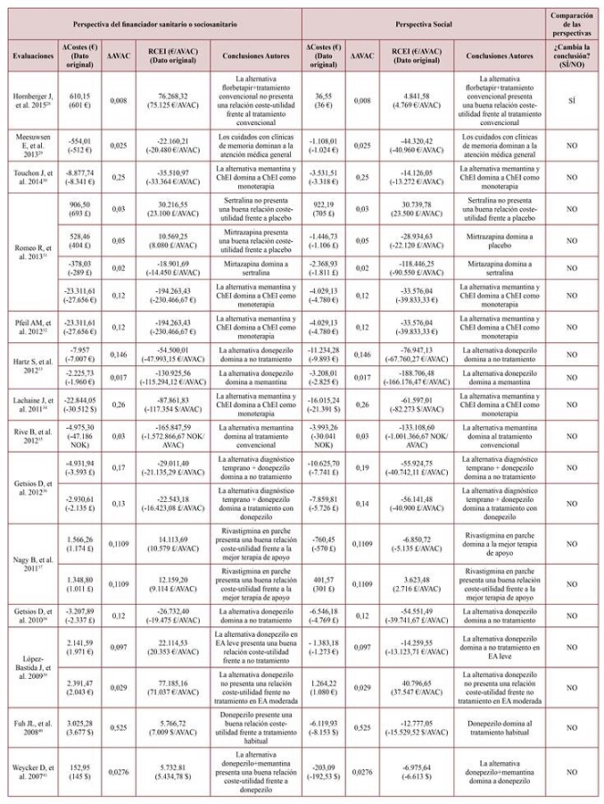 Resultados: Se obtuvieron 6.292 referencias, seleccionándose 245 artículos que podían cumplir los criterios de inclusión. Tras el análisis a texto completo, se seleccionaron 20 publicaciones de las cuales se obtuvieron 27 EE completas (20 corresponden a Alzheimer, 1 a Parkinson y 6 al Ictus). En 20 EE (74,1%) el cambio de perspectiva modifica los resultados, pasando a ser dominantes o incrementando el ahorro de recursos comparando las alternativas desde la perspectiva social. En las 7 restantes, la inclusión de los costes sociales supone un incremento en los costes de la intervención evaluada frente a su control. Únicamente en una EE varían las conclusiones al incluir los costes sociales.