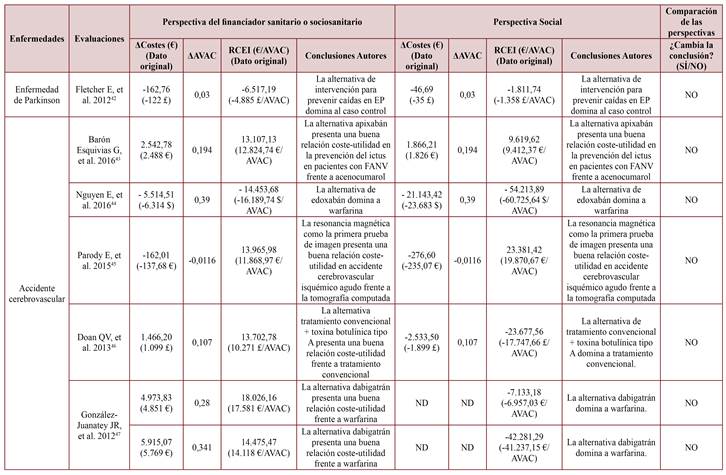 Results: 6,292 references were identified, of which 245 publications meet the selection criteria and were analyzed. After the full-text analysis, 20 references were selected, of which 27 full EE were obtained (20 corresponding to Alzheimer, 1 to Parkinson and 6 to Stroke). In 20 EE (74.1%) the change of the perspective modifies the results, becoming dominant or increasing the saving of the resources by comparing the alternatives from the social perspective. In the remaining 7, the inclusion of social costs involves an increase in the costs of the intervention evaluated against its control. In a single EE, the conclusions vary when including social costs.