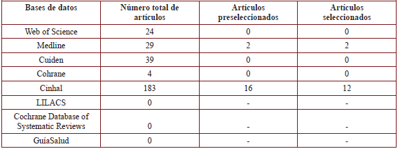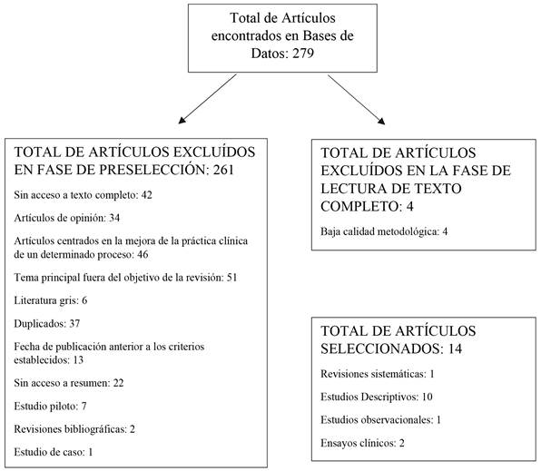 Métodos: Revisión sistemática de las bases de datos de The Cochrane Controlled, Web Of Science, Cinahl, Cuiden, LILACS, Guía Salud y Cochrane Database of Systematic Reviews. Se utilizaron escalas validadas para la selección de 14 artículos finales, siguiendo el formato PRISMA.