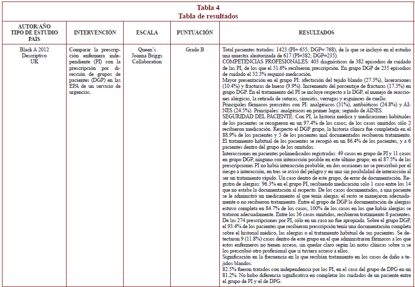 Black, en su estudio sobre la prescripción enfermera en el servicio de urgencias en situaciones de accidentes o en casos de salud sexual, recogió datos importantes que afectarían a la seguridad del paciente: en un 97.4% de pacientes se completó la historia médica y de medicaciones habituales y se manejó un porcentaje del 87.5% de improbabilidad de existir interacciones en accidentes y urgencias, aunque en el caso de la salud sexual éste fue de un 65.9%. No obstante, se señalaron dos situaciones en las que los pacientes recibieron tratamiento sin tener completa toda la documentación clínica personal; la primera en la que se dio medicación de forma inadecuada a un paciente dentro del grupo de “accidentes y urgencias”, y en segundo lugar, dentro del grupo de “salud sexual”, que ocurrió en un 10% del total25.