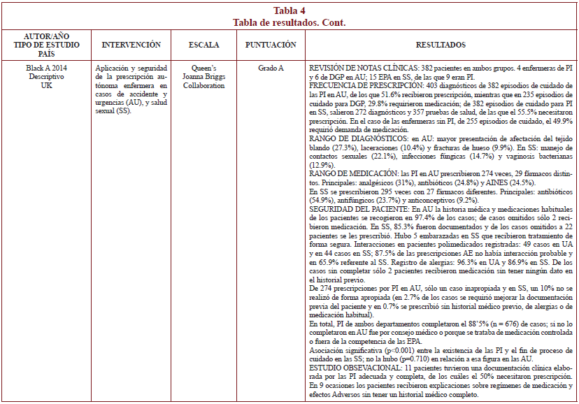La prescripción enfermera (PE) fue el tema principal de varios de los estudios incluidos. Black estudió la diferencia entre dos métodos distintos de PE diferenciados en Gran Bretaña: por una parte, se encuentra la prescripción independiente (PI), entre ciertos fármacos establecidos por ley, y por otra la prescripción por Dirección de Grupos de Pacientes (DGP) en la que se delimitan unas características clínicas de paciente y de acuerdo a eso, enfermería tiene cobertura legal para darles determinada medicación24,25.