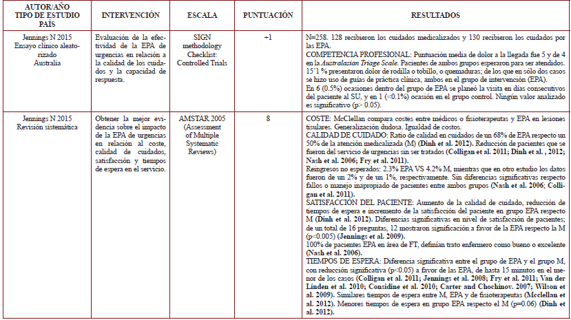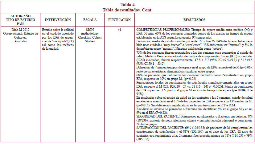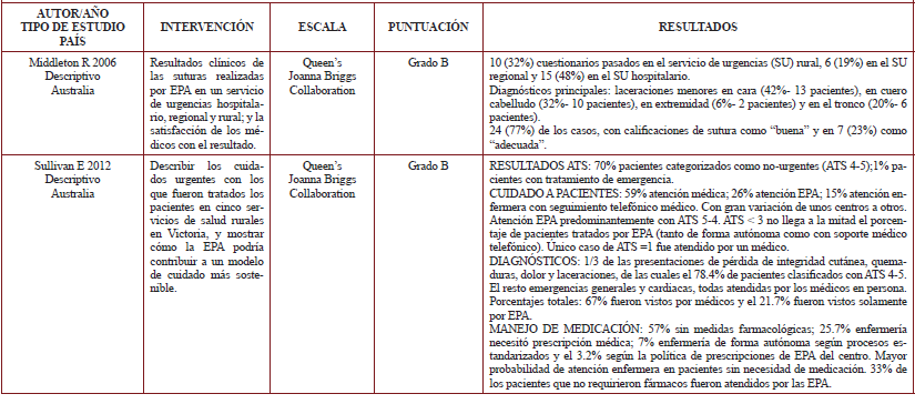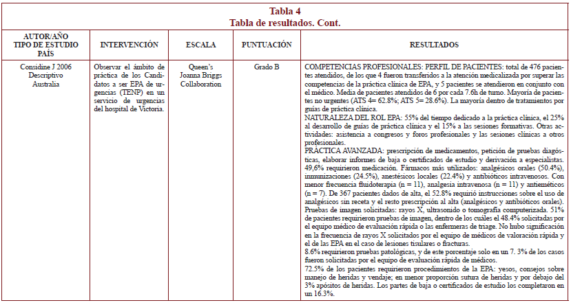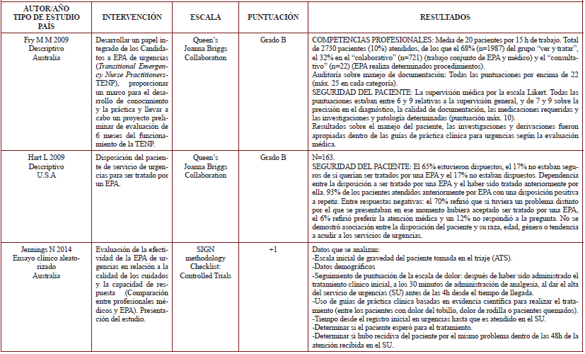 Una limitación encontrada a la hora de extraer los resultados, fue la falta de consenso sobre la figura de la EPA de urgencias y sus distintos roles, lo que no asegura la homegeneidad de las condiciones en las que se basan los artículos incluidos. En el caso de los trabajos de Considine a pesar de cumplir con el mínimo de calidad exigido, no se determinaba de forma precisa el tipo de prescripción enfermera a la que hacían referencia, aunque no se consideró que hubiese afectado globalmente a los resultados expuestos en la revisión21,22.