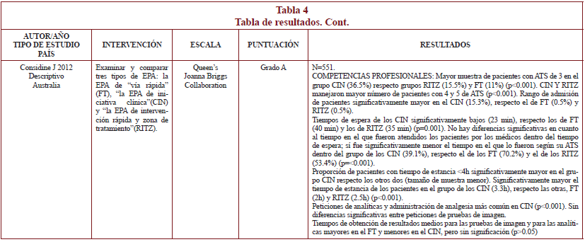 Competencias profesionales. Los nueve estudios que las evalúan coincidieron en un perfil mayoritario de paciente con un rango de gravedad calificado como no-urgente, utilizando la Australasian Triage Scale (ATS) con puntuaciones de entre 4-5 (mínimo de 5 y máximo 1)3,7,14,21,22,23. Aun así, Considine hizo una comparación entre distintos roles dentro de la EPA de urgencias: Emergency Departments Fast Track (FT) para derivar a los pacientes con problemas de salud leves de forma directa; las Clinical Initiatives Nurse (CIN) como una figura adherida al rol de triaje que revisa a los pacientes antes de ser atendidos por el médico de urgencias; o la Rapid Intervention and Treatment Zone (RITZ) que es una expansión del FT para asegurar los objetivos de espera y duración de estancia ante la gran demanda de atención para problemas leves21.