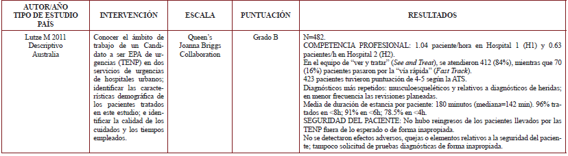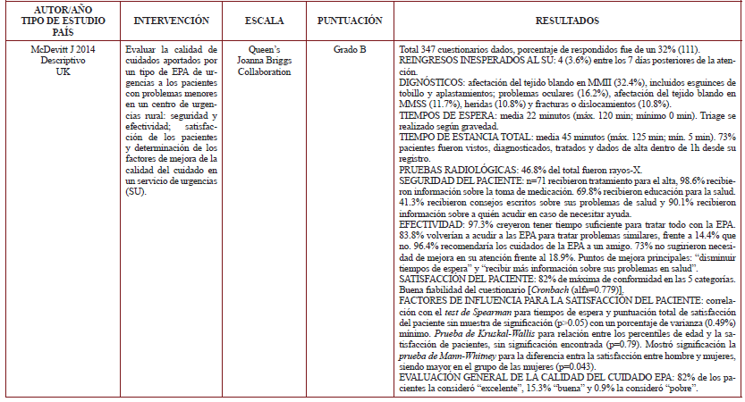 Resultados sobre coste efectividad. En esta línea, Lutze arrojó resultados de un tiempo de estancia medio por paciente de 180 minutos, junto a un 78.5% de pacientes atendidos en menos de 4 horas. Tampoco hubo reingresos no previstos y todas las pruebas diagnósticas solicitadas por las Transitional Emergency Nurse Practitioner(TENP) fueron adecuadas23. Dentro de nuestra revisión, otro estudio evaluó la calidad de los cuidados de las TENP a partir de la supervisión de médicos en su actividad clínica. Se utilizó la escala Likert, mostrando puntuaciones de 6 a 9 en la supervisión general y de 7 a 9 sobre precisión en el diagnóstico, la documentación utilizada, las medicaciones e investigaciones y patologías determinadas (sobre un máximo de 10). También McDevitt analizó elementos similares a los que se tratan en el estudio de Lutze, pero centrados en la EPA de urgencias como tal. En esta ocasión, la media en tiempo de estancia total fue de 45 minutos y el tiempo de espera de 22 minutos. Hubo 4 (3.6%) casos de reingresos inesperados dentro de los 7 días posteriores de la atención en urgencias y uno de ellos acudió en varias ocasiones. En los resultados del cuestionario de satisfacción a los pacientes, la mayoría declararon haber tenido un tiempo suficiente para tratar cualquier cuestión con la EPA durante su estancia en urgencias, aunque casi un 20% refirieron la posibilidad de mejora en cuanto a tiempos de espera y educación para la salud26.