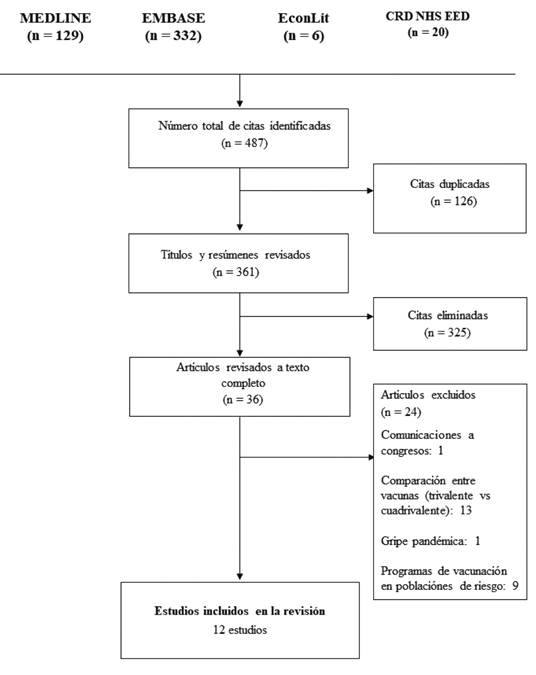 La estrategia de búsqueda realizada para el presente estudio dio como resultado 361 referencias bibliográficas, una vez descartados duplicados. A partir de la valoración de los títulos y resúmenes se seleccionaron 36 referencias de interés potencial y tras la lectura de texto completo, finalmente se seleccionaron para la revisión 12 referencias16,18,19,20,21,22,23,24,25,26,27,28 (entre las que se incluyó el informe de ETS de Beutels et al.16 mencionado anteriormente). En la figura 1 puede verse el proceso de selección de estudios.