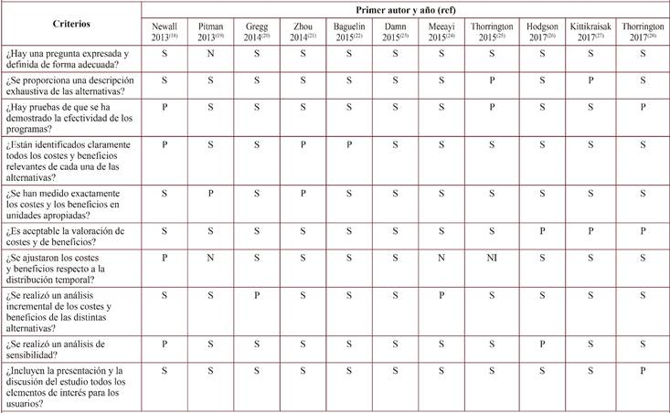 Calidad metodológica. En general la calidad metodológica de las evaluaciones económicas incluidas en esta revisión fue alta. Todos los estudios midieron tanto costes como efectos en las unidades adecuadas, a excepción de las evaluaciones de Zhou et al.21 y Gregg et al.20 que medían la efectividad en “casos de gripe evitados” y no en años de vida. Los artículos incluidos proporcionaron una descripción aceptable de cada una de las alternativas evaluadas. Asimismo, todos los estudios realizaron un análisis de sensibilidad adecuado a excepción de los estudios de Newall et al.18 y Hodgson et al.26 que lo hicieron parcialmente de manera univariante. Los estudios de Meeayi et al.24 y Pitman et al.19 no aplicaron tasa de descuento a costes y/o beneficios a pesar de que consideraron un horizonte temporal de más de un año. El resto de estudios la aplicó de manera correcta a excepción del estudio de Thorrington et al.25 de 2015 que no informó sobre este aspecto. Ninguna de las evaluaciones económicas encontradas se realizó en el contexto español. En la tabla 2 se muestran los resultados de la valoración de la calidad de los estudios de evaluación económica incluidos.