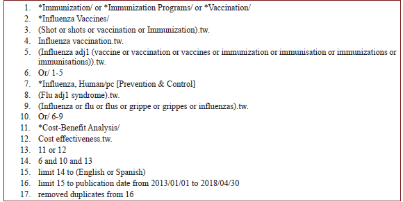 Métodos: Se llevó a cabo una revisión sistemática de la literatura de evaluaciones económicas de los programas de vacunación contra la gripe estacional en niños y adultos. Se realizaron búsquedas en las bases de datos (enero 2013 - abril 2018): Medline y PREMEDLINE, EMBASE, EconLit y en las bases de datos del Centre for Reviews and Dissemination (DARE, HTA, NHS EED).