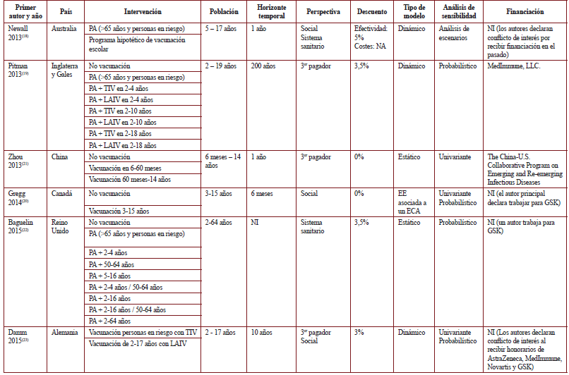 RS e informes de evaluación de tecnologías sanitarias previos. El informe de ETS de Beutels et al. 201316 incluyó 20 estudios que evaluaron, además del coste-efectividad de la vacunación frente a la gripe estacional en niños y jóvenes, la eficacia de la vacuna. Los grupos de edad de estos estudios estuvieron comprendidos entre los 0 y 18 años de edad. La mayoría de los estudios que incluyeron la perspectiva social además de la perspectiva sanitaria o del tercer pagador, obtuvieron que los programas de vacunación en niños consiguen ahorrar costes. Once de los 20 estudios incluidos concluyeron que los programas de vacunación en niños son estrategias coste-efectivas, incluyendo un estudio español que considera la vacunación en niños de 3 a 14 años de edad.