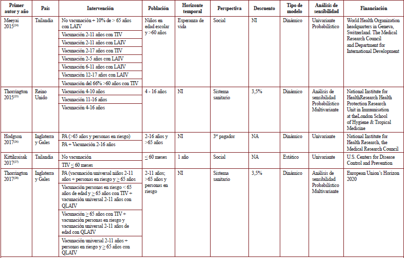 Criterios de inclusión: Se incluyeron evaluaciones económicas completas, publicadas entre enero de 2013 y abril de 2018 en inglés o español, en las que se comparaban costes y beneficios de algún programa de vacunación contra la gripe estacional en diferentes grupos de edad frente a no vacunar o frente a otros programas de vacunación, mediante alguna de las siguientes técnicas de análisis: análisis coste-efectividad (ACE), análisis coste-utilidad (ACU) y análisis coste-beneficio (ACB). Se incluyó población general de cualquier sexo y edad candidata a participar en un programa de vacunación contra la gripe estacional.