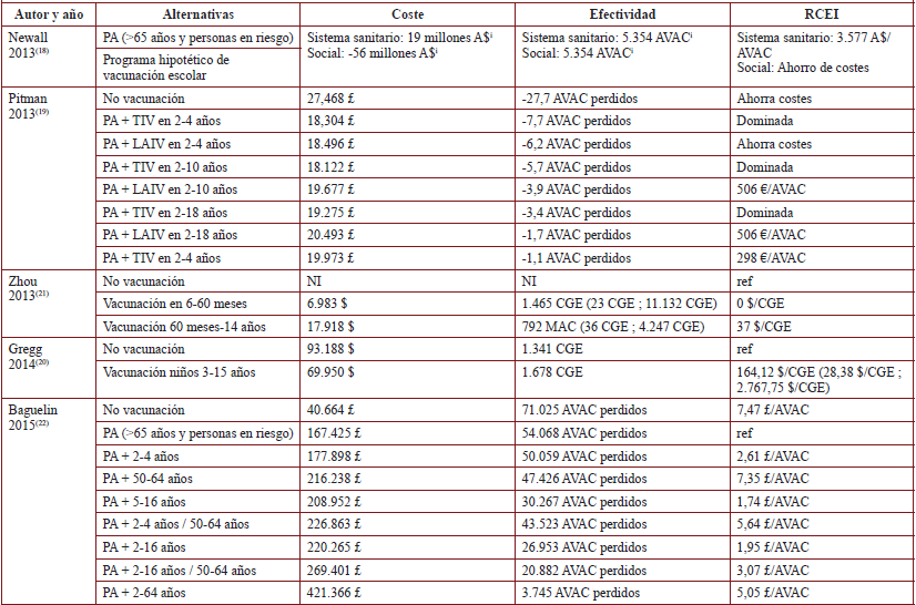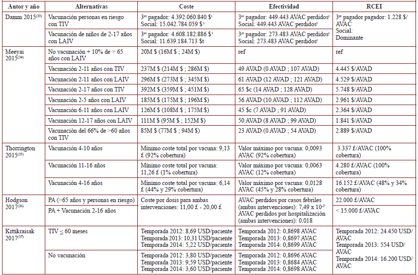 La revisión sistemática de Peasah et al. (2013)11 incluye 140 estudios que llevan a cabo evaluaciones económicas de la vacuna antigripal. El conjunto de las evaluaciones económicas incluye de manera dispar programas de vacunación bien en personas de edad avanzada, niños y personas en edad adulta. De los 140 estudios, se encontraron 118 realizados en países de renta alta y 22 en países de renta media-alta; concretamente 39 en países europeos. La mayoría de las evaluaciones económicas de la vacunación antigripal incluidas en esta revisión concluye que los programas de vacunación ahorran costes y son alternativas coste-efectivas a partir de los 50 años de edad. Esta revisión incluye una evaluación económica realizada en el contexto español y publicada en 200730 en la que se evalúa, mediante un árbol de decisión, el coste-efectividad de la vacunación en adultos de entre 50 y 64 años de edad desde la perspectiva del tercer pagador y desde la perspectiva social. Los autores de este estudio estiman una RCEI de 14.919 €/AVAC y de 9.731 €/AVG desde la perspectiva del tercer pagador y una RCEI de 4.149 €/AVAC y de 2.706 €/AVG desde la perspectiva social. Sin embargo, los autores recomiendan cautela debido a la elevada incertidumbre en los parámetros estimados para el modelo de evaluación económica.