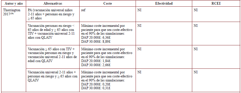 Los tres estudios más recientes que evaluaron el coste-efectividad de programas de vacunación frente a la gripe estacional se publicaron en el año 201726,27,28. El estudio de Hodgson et al.26 tuvo por objetivo evaluar el coste-efectividad del programa de vacunación en personas mayores y/o en riesgo a partir de la introducción en 2013 de un programa de vacunación infantil frente a la gripe estacional. Los resultados del estudio sugirieron que la presencia de un programa de vacunación en la infancia podría reducir el número de contagios en personas mayores, aunque el programa de vacunación en adultos seguiría siendo una estrategia coste-efectiva desde la perspectiva sanitaria. El estudio tailandés de Kittikraisak et al.27 sugirió que la introducción de un programa de vacunación infantil frente a la gripe estacional empezaría a ser coste-efectivo a partir del tercer año de introducción, dejando de manifiesto la relación entre la temporada estacional y el coste-efectividad del programa. Sin embargo, éste fue el único estudio que hizo referencia a este aspecto. Por último, el estudio de Thorrington et al. (2017)28 evaluó el coste-efectividad de un programa de vacunación infantil en Inglaterra y Gales con la nueva vacuna cuadrivalente en lugar de la habitual trivalente utilizando el mismo modelo de evaluación económica desarrollado en el estudio anterior de Baguelin et al.22. Los autores concluyeron que la introducción de la vacuna cuadrivalente para la gripe estacional en niños de 2 a 11 años de edad era una estrategia coste-efectiva desde la perspectiva del sistema sanitario28.