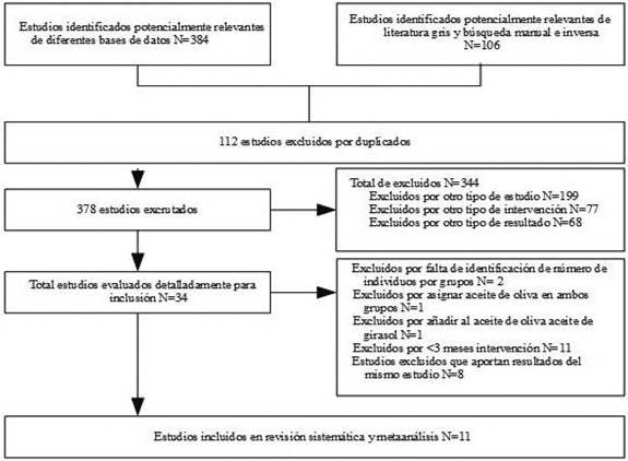 Criterios de inclusión. Se han utilizaron los siguientes criterios de inclusión: a) población adulta con al menos 18 años, independientemente de su sexo, sin eventos cardiovasculares previos; b) intervención: dieta enriquecida con aceite de oliva durante al menos 12 semanas; c) comparador: dieta enriquecida con otra grasa; d) efectos: peso, IMC o perímetro abdominal; y d) diseño de estudios incluidos: ensayos clínicos aleatorizados (ECA).