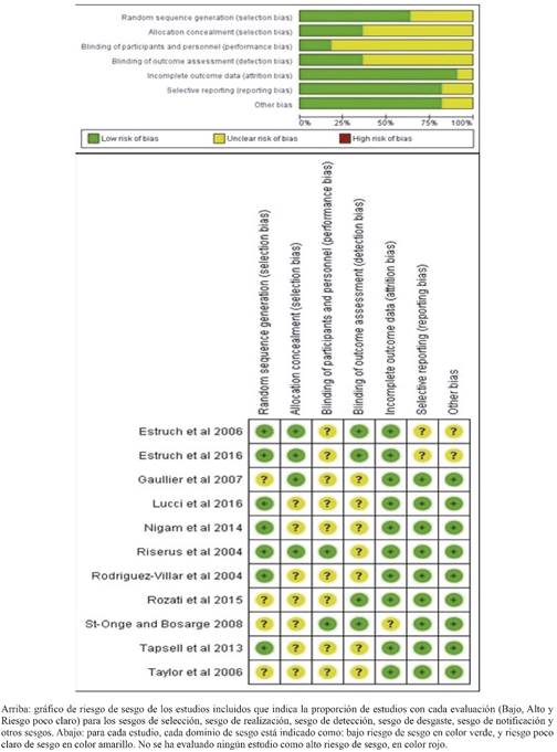 Evaluación de la validez. La selección de los artículos candidatos a ser identificados se hizo por dos investigadores de manera independiente; en caso de discrepancia un tercer investigador tomó la decisión. Cada artículo recuperado se evaluó por dos revisores independientes, y en caso de discordancia un tercer investigador fue consultado. Para la evaluación del riesgo de sesgo se utilizó la herramienta Cochrane30. Para cada estudio se consideró si tenían alto riesgo, bajo o riesgo poco claro de sesgo, mediante la valoración de los siete dominios: generación de la secuencia, ocultación de la asignación, cegamiento de participantes, personal y evaluadores, datos de resultados incompletos, notificación selectiva de los resultados y otros sesgos. Los estudios incluidos tras el análisis de validez se muestran en la tabla 1.