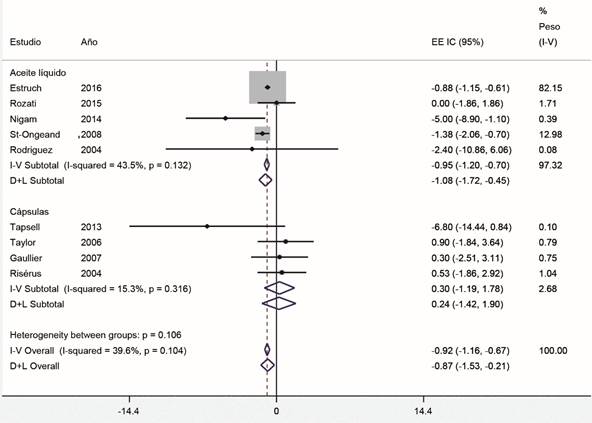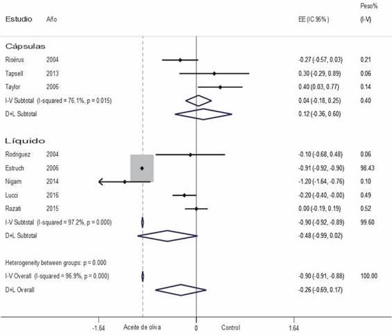 Se ha realizado un análisis de subgrupos para determinar el tipo de administración de aceite de oliva que aporta más beneficios. El modelo de efectos fijos revela que el aceite de oliva líquido desciende el peso casi 1 kg, -0.95 kg, IC 95% (-1,20, -0.70); I2 =43,5%, p heterogeneidad = 0,13 (figura 3), mientras que no hubo reducción significativa con cápsulas.