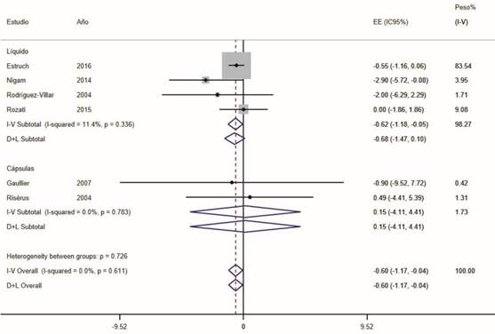 En el caso del perímetro de la cintura el modelo de efectos fijos encuentra que el aceite de oliva la redujo en -0,6 cm, IC 95% (-1,17,-0,04), p= 0,03, sin heterogeneidad I2= 0%, p heterogeneidad = 0,61 (figura 4). Con el suplemento de aceite en forma líquida se observó disminución de cintura, -0,62 cm (IC 95%: -1,18, -0,05), y no con el suplemento en cápsulas (figura 4).