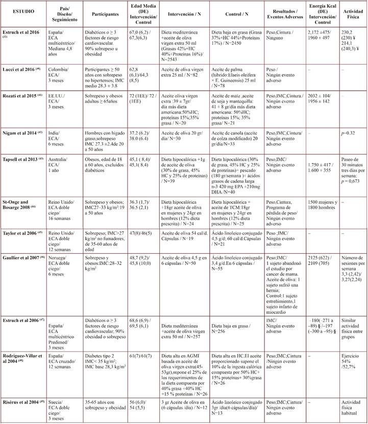 Extracción de datos. Se han extraído los siguientes datos de cada estudio: autores, año de publicación, país de realización, duración, cantidad de aceite de oliva ingerido y control utilizado, características y número de participantes en cada intervención aplicada, resultados de peso, índice de masa corporal, y perímetro abdominal, energía consumida y actividad física realizada (tabla 1). La extracción de datos se realizó por dos autores independientemente, mediante un formato estándar.