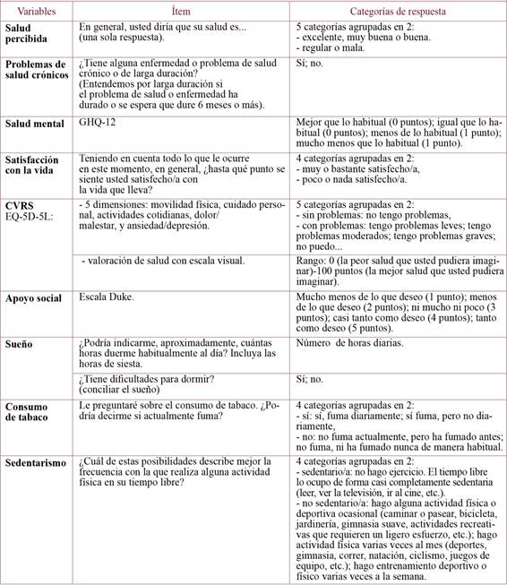 Asimismo, se analizaron la satisfacción con la vida, los hábitos de vida (el sueño, el consumo de tabaco, el sedentarismo), la CVRS y el apoyo social. La valoración de la CVRS se llevó a cabo mediante el instrumento EQ-5D-5L estandarizado y validado, para medir la calidad de vida en personas de 15 y más años23. Es un instrumento genérico de medición de la CVRS, que consta de dos apartados: a) una parte descriptiva con 5 ítems que analizan cinco dimensiones (movilidad, cuidado personal, actividades cotidianas, dolor/malestar y ansiedad/depresión) y en la que las cinco categorías de respuesta se agruparon en dos (sin problemas y con problemas); b) una escala visual en la que se valora la salud y que va de 0 (peor estado de salud imaginable) a 100 (mejor estado de salud imaginable). En la primera parte la fiabilidad fue de α= 0,57 (0,66 en hombres y 0,51 en mujeres). Se calculó el índice sintético de EQ-5D-5L empleando la herramienta que relaciona las respuestas de cinco y tres categorías24, considerándose una CVRS mala o regular con valores inferiores a 0,85 y buena en el resto de casos25.