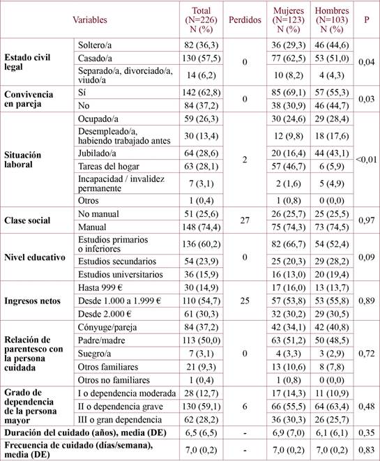 La edad media de las personas cuidadoras no mostró diferencias significativas entre mujeres (61,5±13,0 años) y hombres (63,5±17,4 años). Como puede observarse en la tabla 2, en ambos sexos, se trataba mayoritariamente de personas casadas que convivían en pareja, pertenecían a la clase manual y que contaban con estudios primarios o inferiores. Cuidaban diariamente principalmente a su padre o madre. Los hombres llevaban cuidando una media de 6,1 años y las mujeres 6,9 años. Únicamente se observaron diferencias significativas por sexo en el estado civil (con mayor proporción de casadas que de casados), la convivencia en pareja, que era menos frecuente en los hombres, y la situación laboral. Se apreciaba un predominio de jubilados entre los hombres y de quienes se ocupaban de las labores del hogar entre las mujeres.