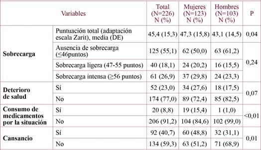 Results: Women and men were over 60 years old, married, with primary education or less, and took care of their parents mainly. Women presented worse perceived health (46.3% vs 32.0%) and mental health (23.3% vs 13.9%), and more problems in the dimensions of anxiety/depression (35.0% vs 21.4%) and pain/discomfort (52.8% vs 31.1%) of EQ-5D-5L.The regression model showed greater risk of fatigue (OR = 2.83; 95% CI:1.53-5.24) and burden (OR = 1.87; 95% CI: 1.06-3.29) among women than among men.