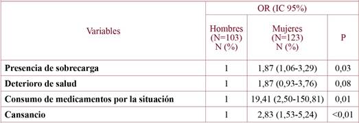 Las asociaciones de ser mujer con el consumo de medicamentos y tener cansancio fueron las que mostraron un valor de odds ratio más alto. Así, se observó que existía una asociación entre ser mujer y consumir medicamentos por la provisión de cuidado (p<0,05), y que las mujeres tenían 2,83 veces más probabilidades de presentar cansancio y 1,87 veces más probabilidades de tener sobrecarga.