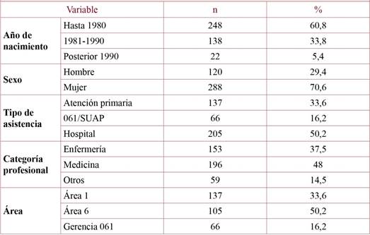 Se revisaron 408 historias de trabajadores que habían nacido a partir del año 1971, de los cuales un 60,8% nacieron entre el año 1971-1980, siendo un 5,4% menor de 27 años. Mayoritariamente eran mujeres (70,6%), que trabajaban en hospitales (50,2%) en la categoría de personal de enfermería (auxiliares y enfermeras 37.5%) (tabla 1).