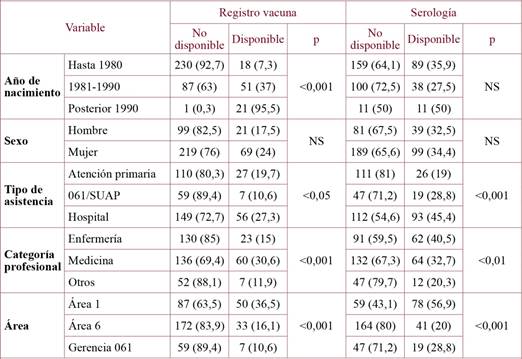 Encontramos diferencias (p<0,001) según el año de nacimiento en la disposición del registro de las vacunas, teniendo documentadas las dosis recibidas del 95,5% de los trabajadores nacidos después del año 1990, mientras sólo había datos del 7,3% de los nacidos antes de 1980.
