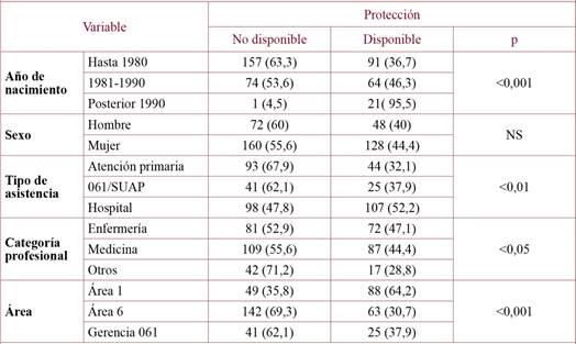 Uniendo ambos aspectos, y valorando la disponibilidad de datos sobre la protección frente al sarampión, obtuvimos diferencias significativas según año de nacimiento (p<0,001), existiendo más datos del personal más joven (95,5%); según el tipo de asistencia (p<0,01) con más datos del personal de hospital (52,25); según categoría profesional (p<0,05) siendo el porcentaje de otras categorías profesionales (celadores, conductores de ambulancias, técnicos de emergencias…) de los que menos datos se obtuvieron (28,8%), y según el área (p<0,001), siendo el área 1 del que más datos había (64,2%) (tabla 3).